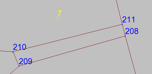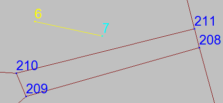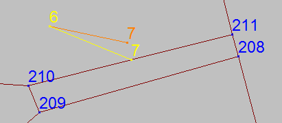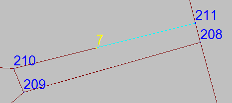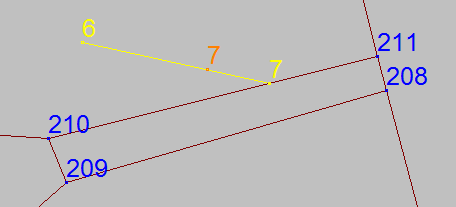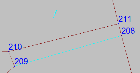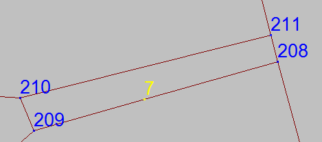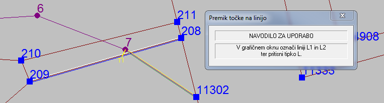 Pri tem bodimo pozorni, kako se je spremenil simbol točke 7. Pred posegom je imela točka 7 simbol krožec, kar pomeni, da je imela le ZKP koordinate. Po premiku na linijo pa je spremenila simbol v kvadrat, kar pomeni, da ima sedaj tudi ZKN koordinate! Kot smo pojasnili že pri načinu 1a, ukaz Premik točke na linijo namreč točki določi tudi manjkajoče koordinate, če imata obe oglišči linije znane obojne koordinate. Tako je točka 7 sedaj na liniji med točkama 208 in 209 v ZKP in tudi v ZKN (tako, da je razmerje 209-7 : 7-208 v obeh sistemih enako).