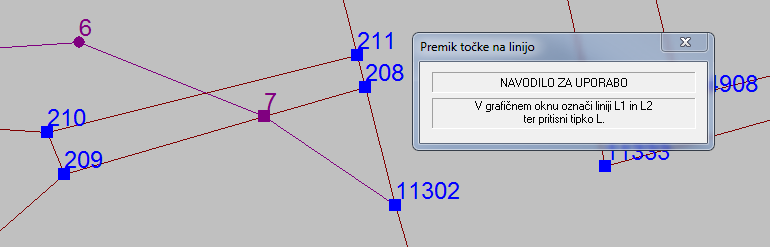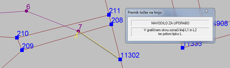 Izbrana točka se bo pravokotno projicirala na najbližjo linijo in se premaknila na lokacijo svoje pravokotne projekcije. Linija se bo na tem mestu razcepila in nastali bosta dve novi liniji. V prikazanem primeru bosta namesto linije 210-211 nastali liniji 210-7 in 7-211.
