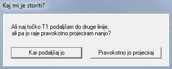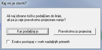 Sedaj sta na voljo dve možnosti. Točko 7 lahko pravokotno projiciramo na najbližjo linijo, ali pa jo premaknemo na najbližjo linijo v smeri daljice 6-7 (kot podaljšek daljice 6-7). Zato bo v takem primeru program od uporabnika zahteval odločitev, katero izmed omenjenih dveh možnosti naj uporabi. Prikazalo se bo pogovorno okno, kot ga prikazuje spodnja slika.