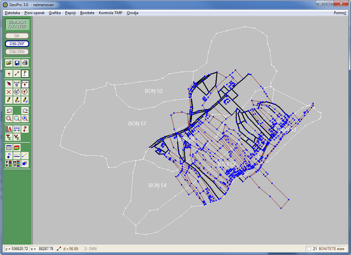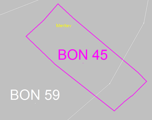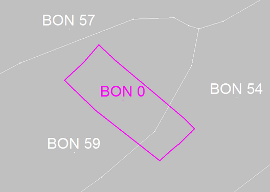 V našem primeru smo bonitete uvozili na sloj 21. Sloj je bele barve. Znotraj vsakega poligona območja enake bonitete stoji centroid s podatki o boniteti. To je poseben tip centroida, ki s seboj nosi drugačne podatke kot parcelni centroid zemljiškega katastra. V grafiki ga prepoznamo po besedici BON, za katero je izpisano število bonitetnih točk območja, ki mu centroid pripada. Če desno kliknemo na bonitetni centroid, se odpre pogovorno okno s podatki o bonitetnem območju.