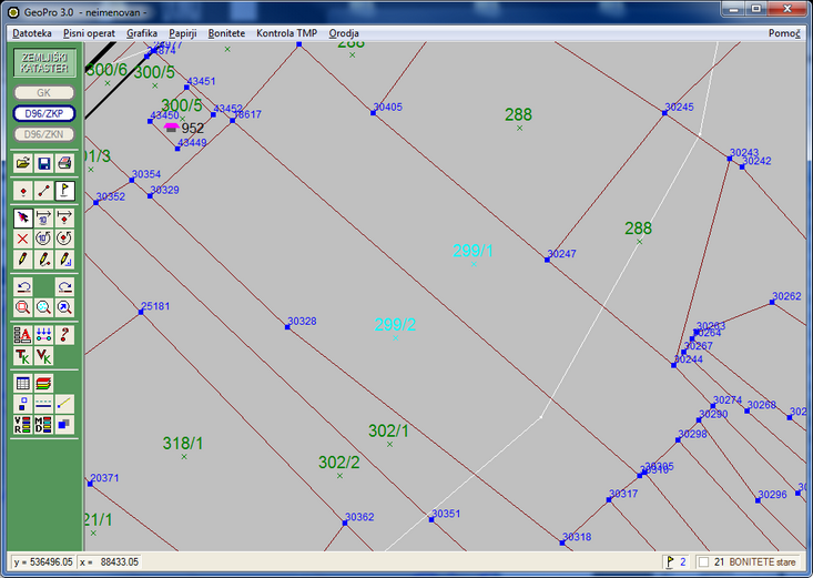Bonitete in meritvene točke, ki smo jih dobili od geodetske uprave in jih uvozili, ležijo na slojih 21 in 22. Ta dva sloja imata izklopljeno topologijo, saj ju ne bomo izvažali in nas zato prav tako ne zanimata več.