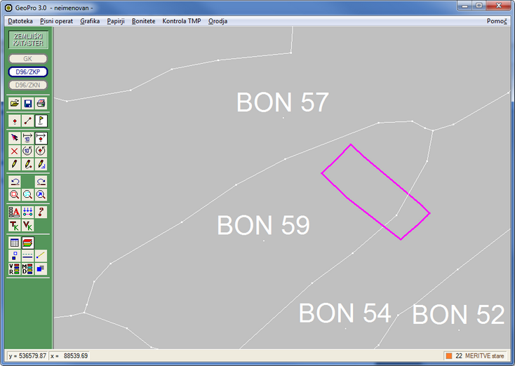 Novo območje bomo ustvarili na sloju 23. Če smo obodne točke območja nove bonitete izmerili na terenu, jih uvozimo na sloj 23. Če pa bo meja območja bonitete potekala kar po meji naročnikovih parcel, pa bomo meje parcel enostavno klonirali na sloj 23, tako da bodo tam tvorile hkrati tudi mejo novega območja bonitete.