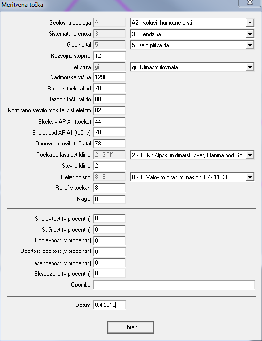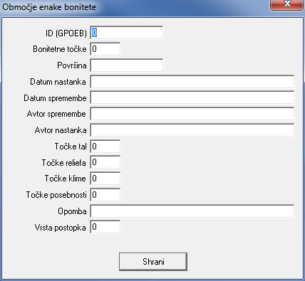 Obvezni podatki so Bonitetne točke, Točke tal, Točke reliefa, Točke klime in Točke posebnosti. Ostala polja lahko pustimo prazna.